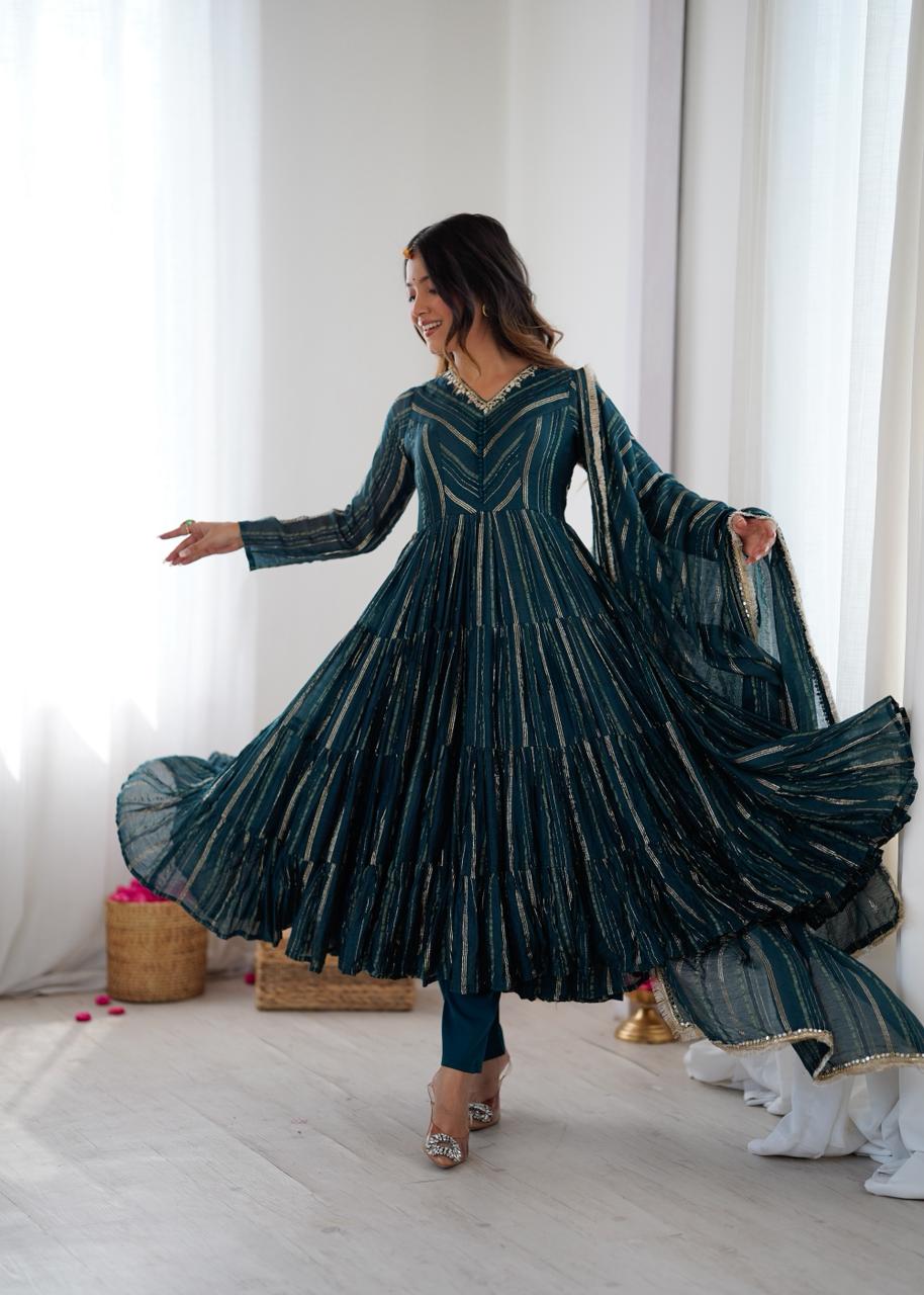 Gold stripe Anarkali gown Lurex stripe Anarkali kurta, Teal blue Anarkali gown Bottle green Anarkali dress