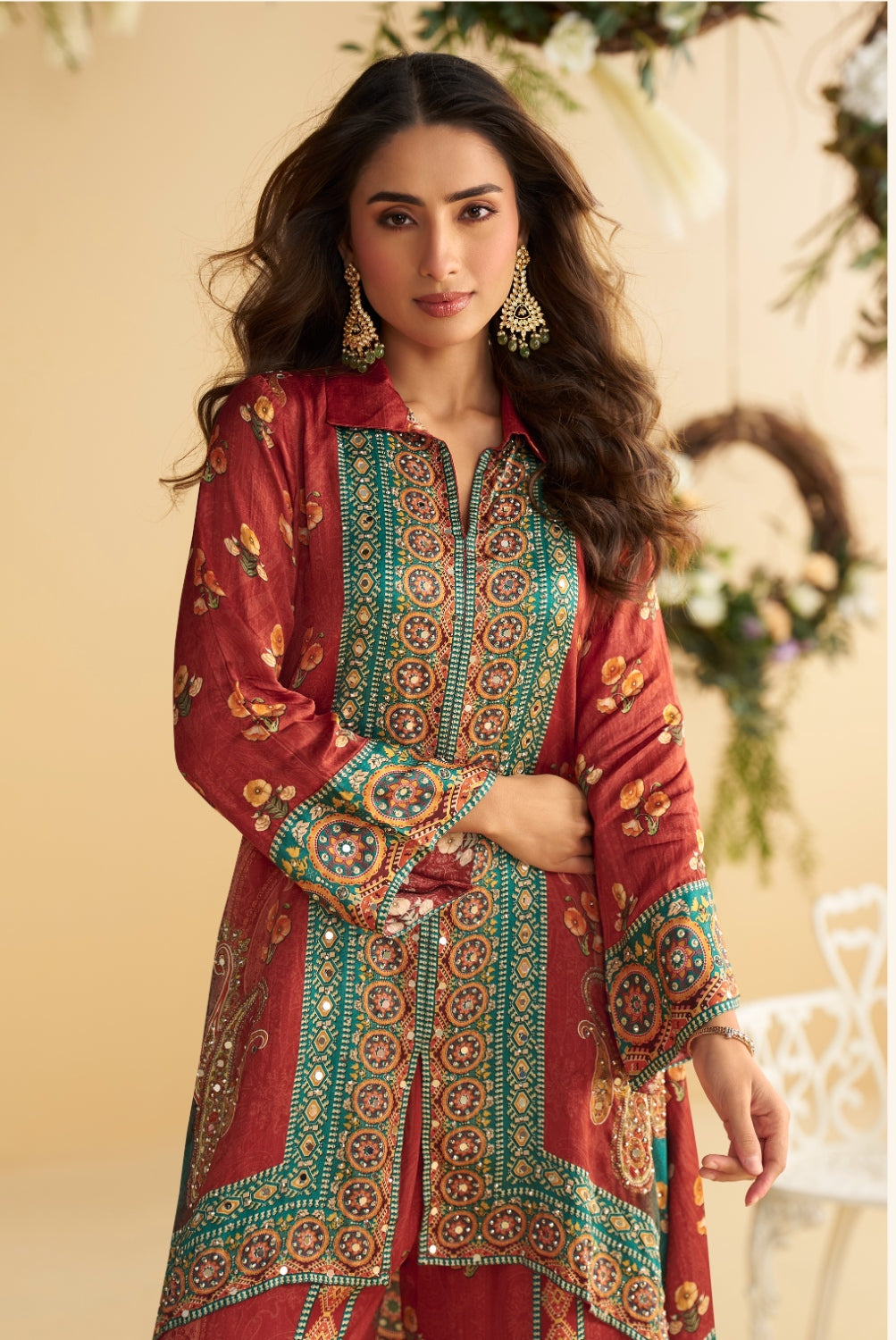 Red Real Premium Digital Crep Silk Readymade Cord Set with Mirror work